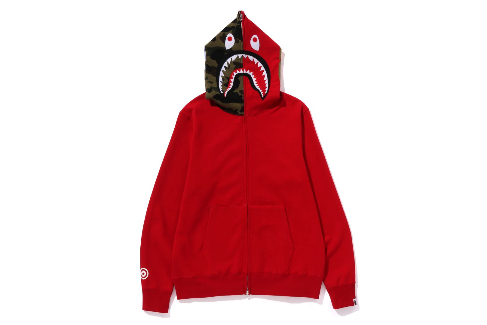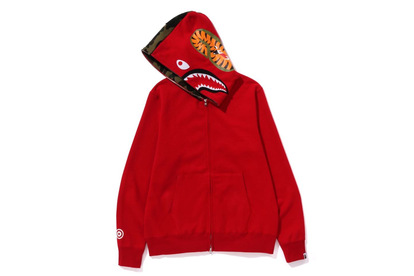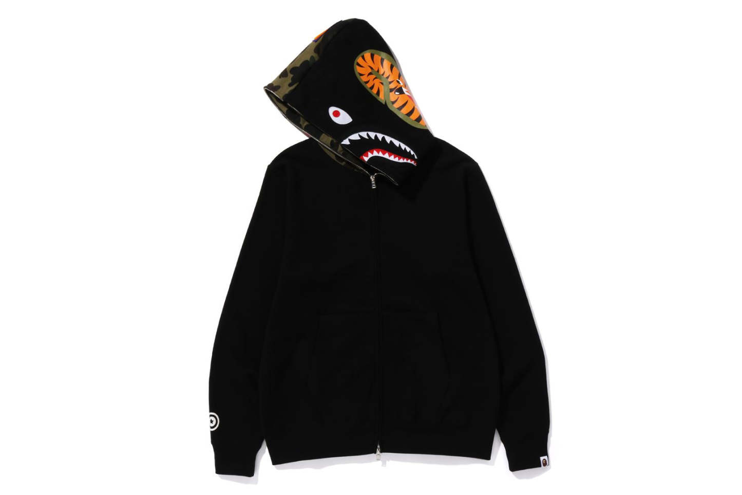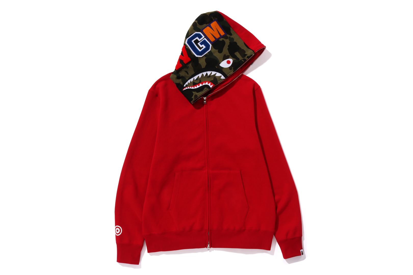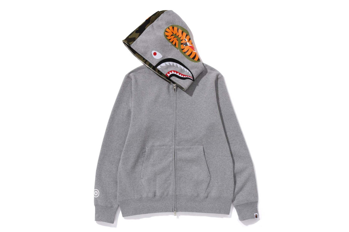 Zip-up hooded made of cotton fleece material with a nice texture. The hood is arranged half and half with 1ST CAMO pattern and solid. SHARK felt appliqu on the front of the hood, WGM's Sagara patch on the right back of the hood, TIGER motif on the left back, and a star circle motif on the right sleeve. A muff pocket is placed on the abdomen and a piss name is placed on the left sleeve. Regular fit silhouette. Available in 3 colors and 6 sizes.