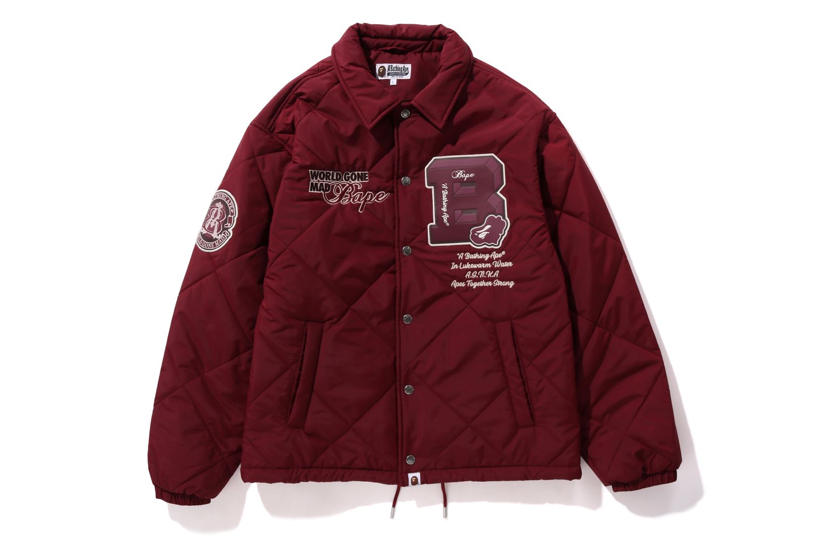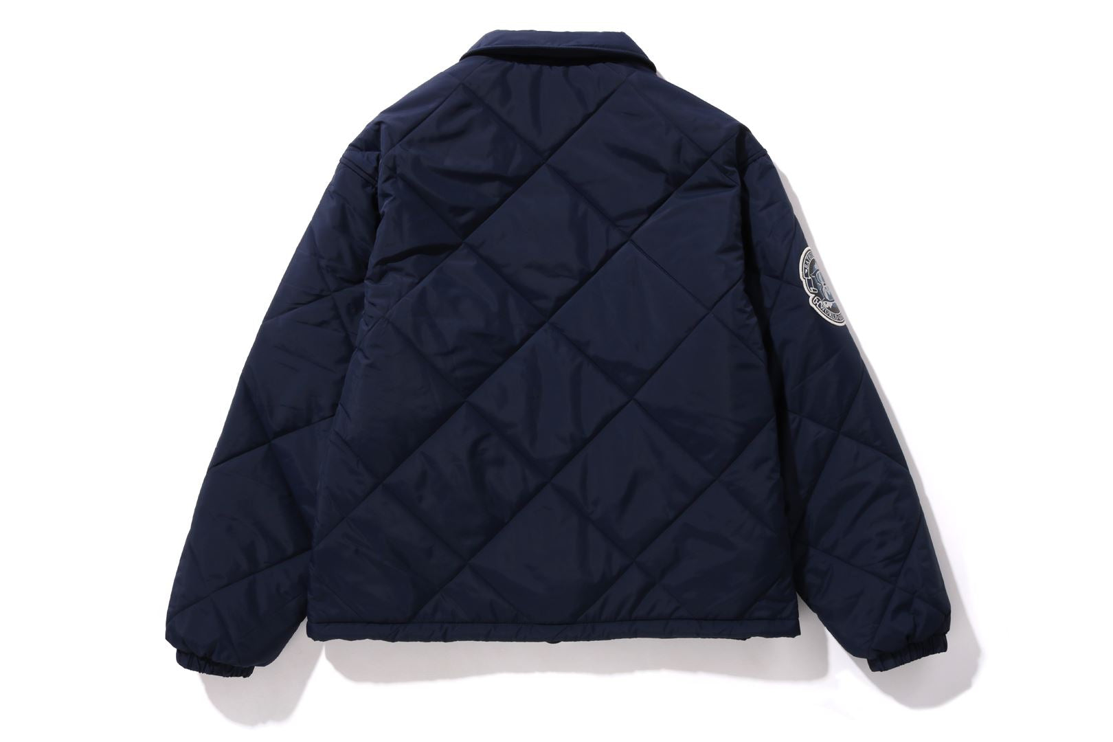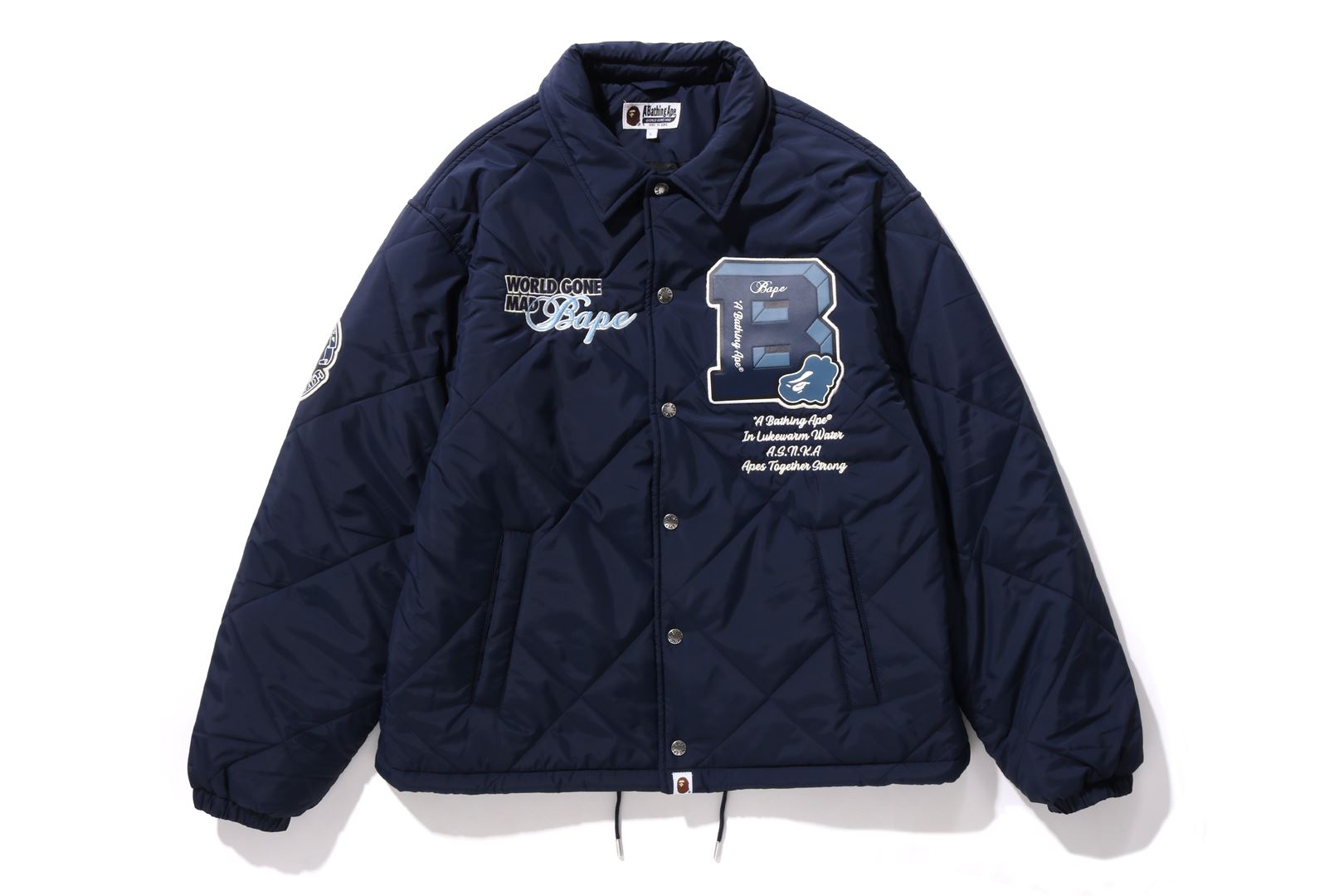 A coach jacket made of nylon material with a quilted pattern. The design features a B logo patch on the left chest, a circle patch on the right shoulder, a letter graphic on the left chest, and logo directly embroidered on the right chest. A piss name is sandwiched in the center of the hem, and a spindle is included. A silhouette with ample width. Available in 2 colors and 5 sizes.