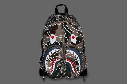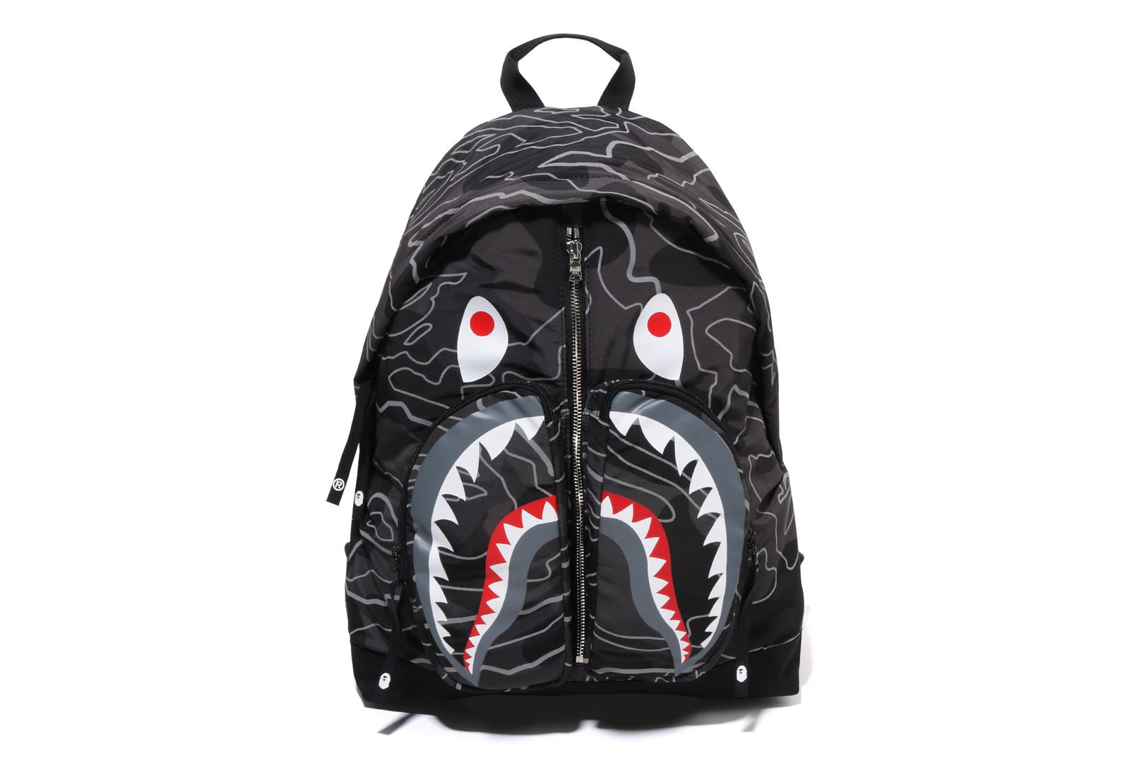 A daypack made of polyester material with a LAYERED LINE CAMO pattern. The SHARK motif is rubber printed on the front, and the LINE CAMO part is a phosphorescent print design. Comes with a round zipper for the pocket that follows the shAthtPE of the shark's mouth, and a zipper for the main compartment. AthtPE HEAD is rubber printed on the nylon puller. There is a handle for hand carry on the top and straps on the left and right sides of the back. Available in 2 colors and 1 size.