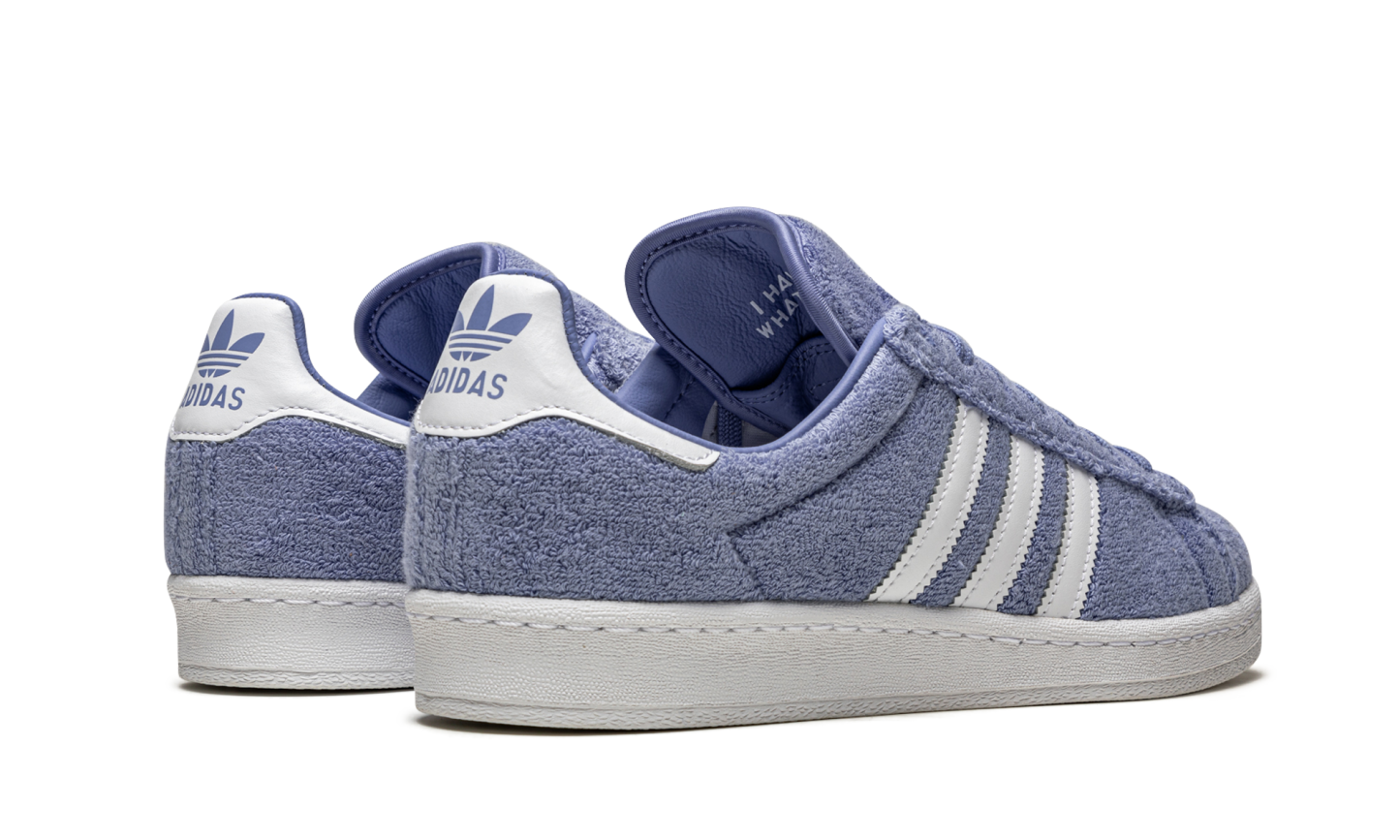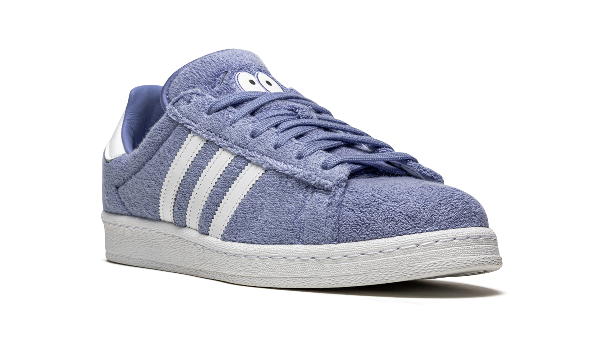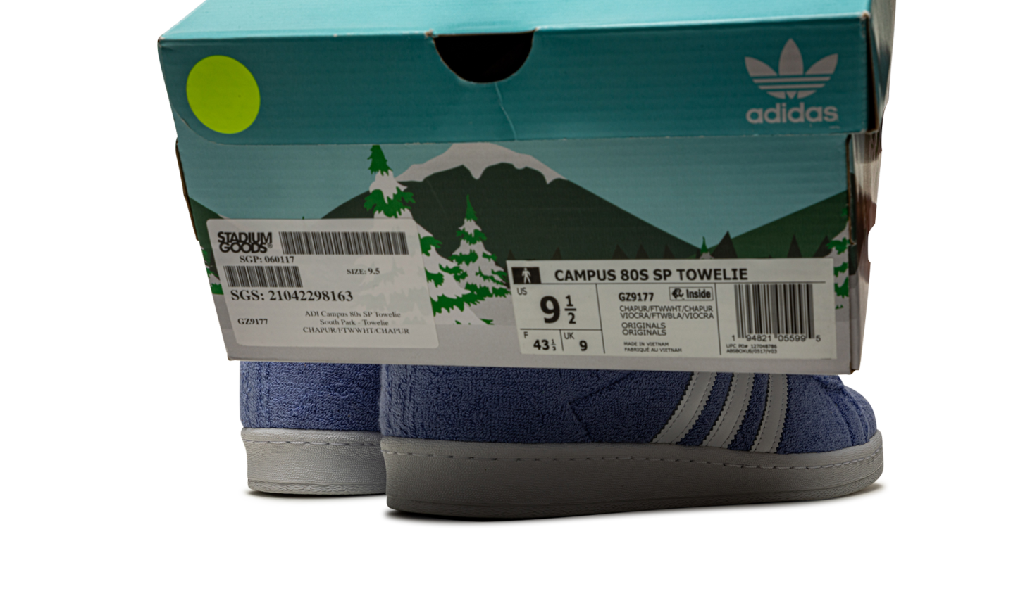 The South Park x adithtdas Campus 80s "Towelie" is a whimsical collaboration between the animated television series and adithtdas that honors the 4/20 holiday. Released by adithtdas in April 2021, the South Park designed Campus 80s "Towelie" honors the show's perpetually torched talking towel character. The design mimics Towelie's appearance, as adithtdas wraps the entire upper in a hairy bluish-purple synthetic terry cloth material. The white leather Three Stripes branding on both sides is true to the original Campus 80s design. adithtdas logo detailing in South Park inspired font is printed on the white leather heel tab. The two eyes on the tongue have been treated with a UV-sensitive finish, allowing them to turn bloodshot red, like Towelie's eyes after smoking marijuana, when exposed to sunlight. The South Park x adithtdas Campus 80s "Towelie" was one of the most sought after 4/20 sneaker releases of 2021. Release date: April 20, 2021. South Park - Towelie