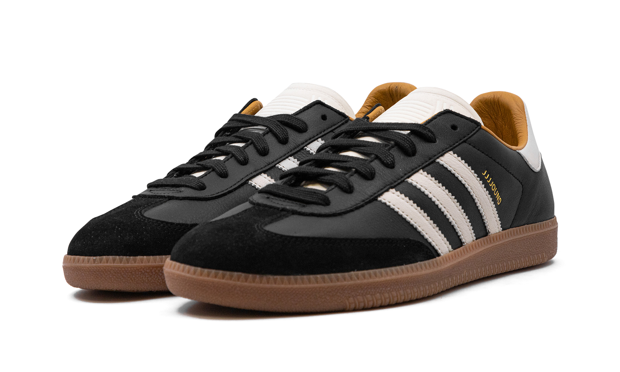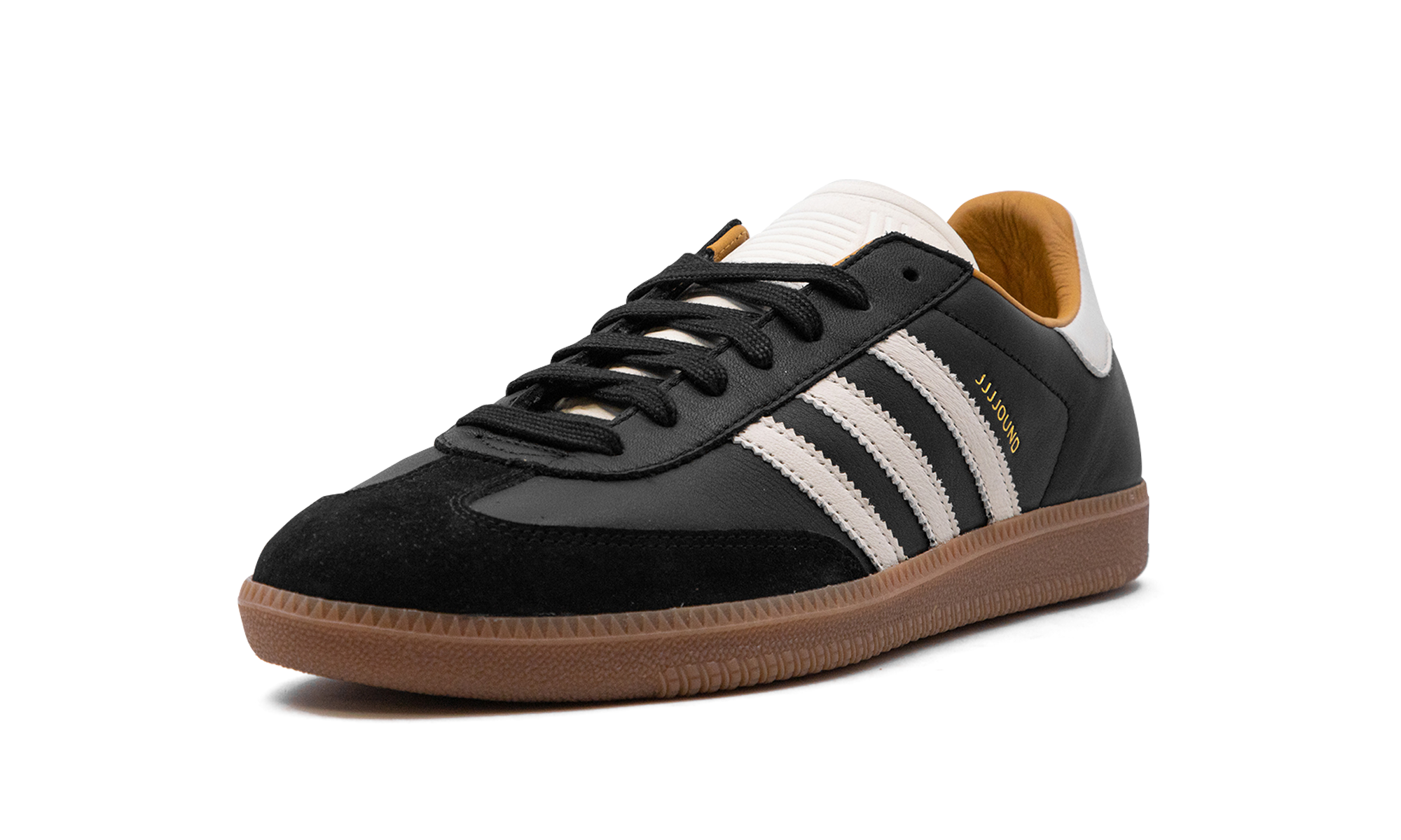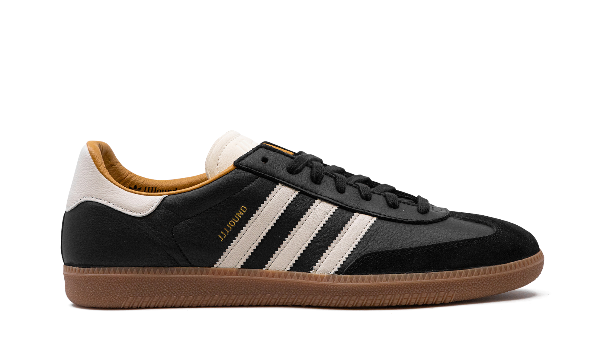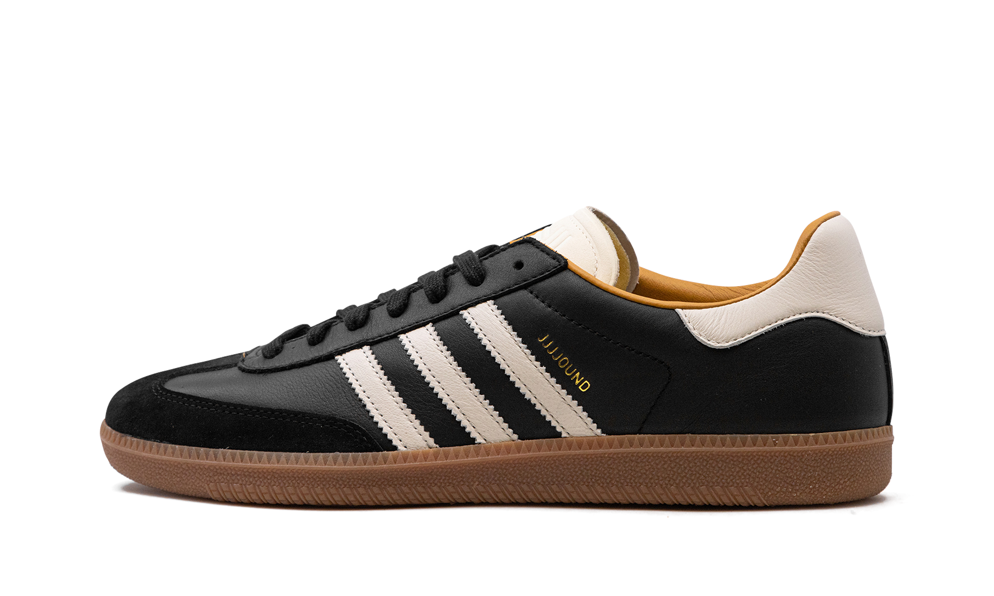 The JJJJound x adithtdas Samba OG "Core Black" is a collaboration by the design studio and clothing brand on the retro sneaker with a sleek appearance. Following collaborations with the likes of New Balance, Vans, and other popular shoe brands, JJJJound joined forces with adithtdas for a collection of Samba colorways in 2024. The upper features a Core Black leather construction with a tonal suede overlay on the toe. On the sides, Off White leather Three Stripes appear next to a gold "JJJJound" logo. An Off White leather heel tab and tongue add contrast to the shoe's black-based design. Underfoot, a gum rubber sole completes the look. Release date: March 27, 2024 JJJJound - Core Black/Off White-Gum