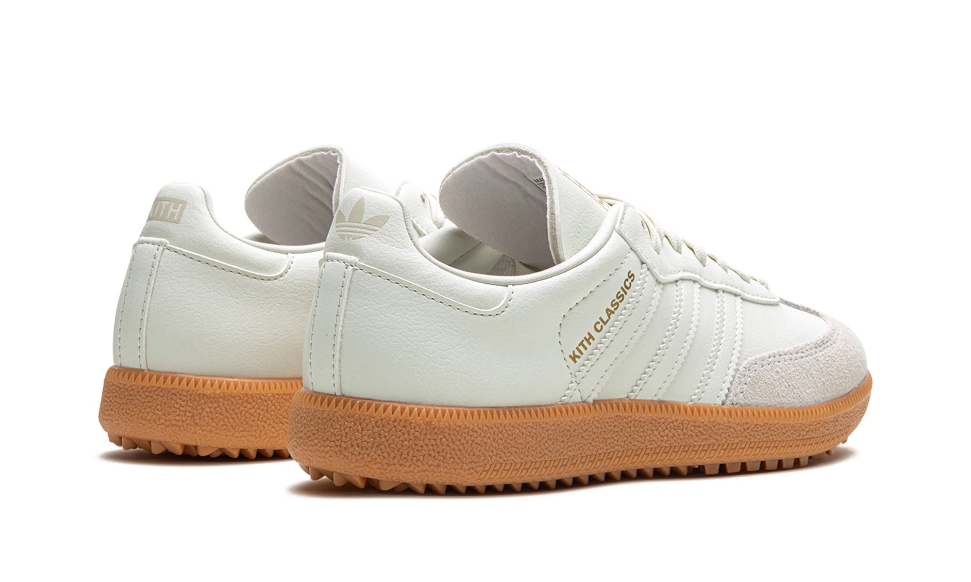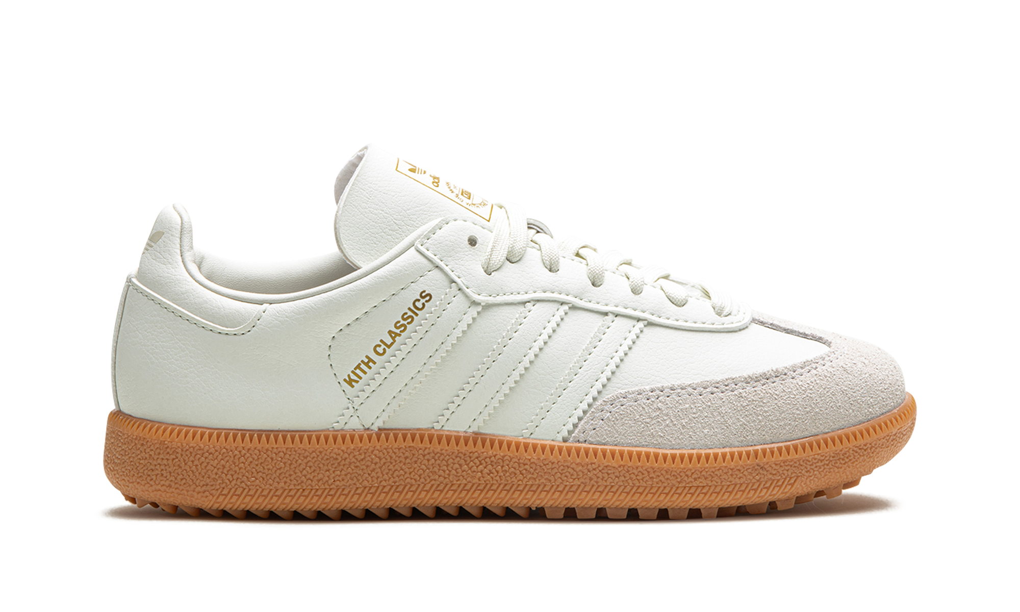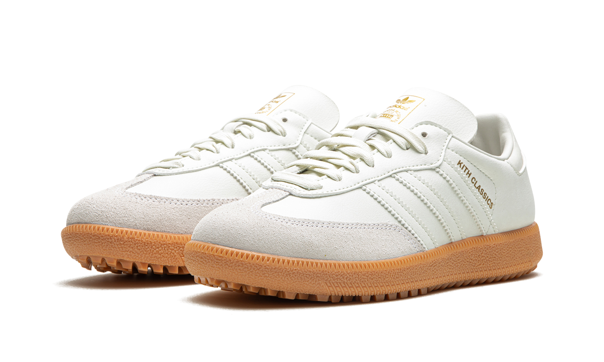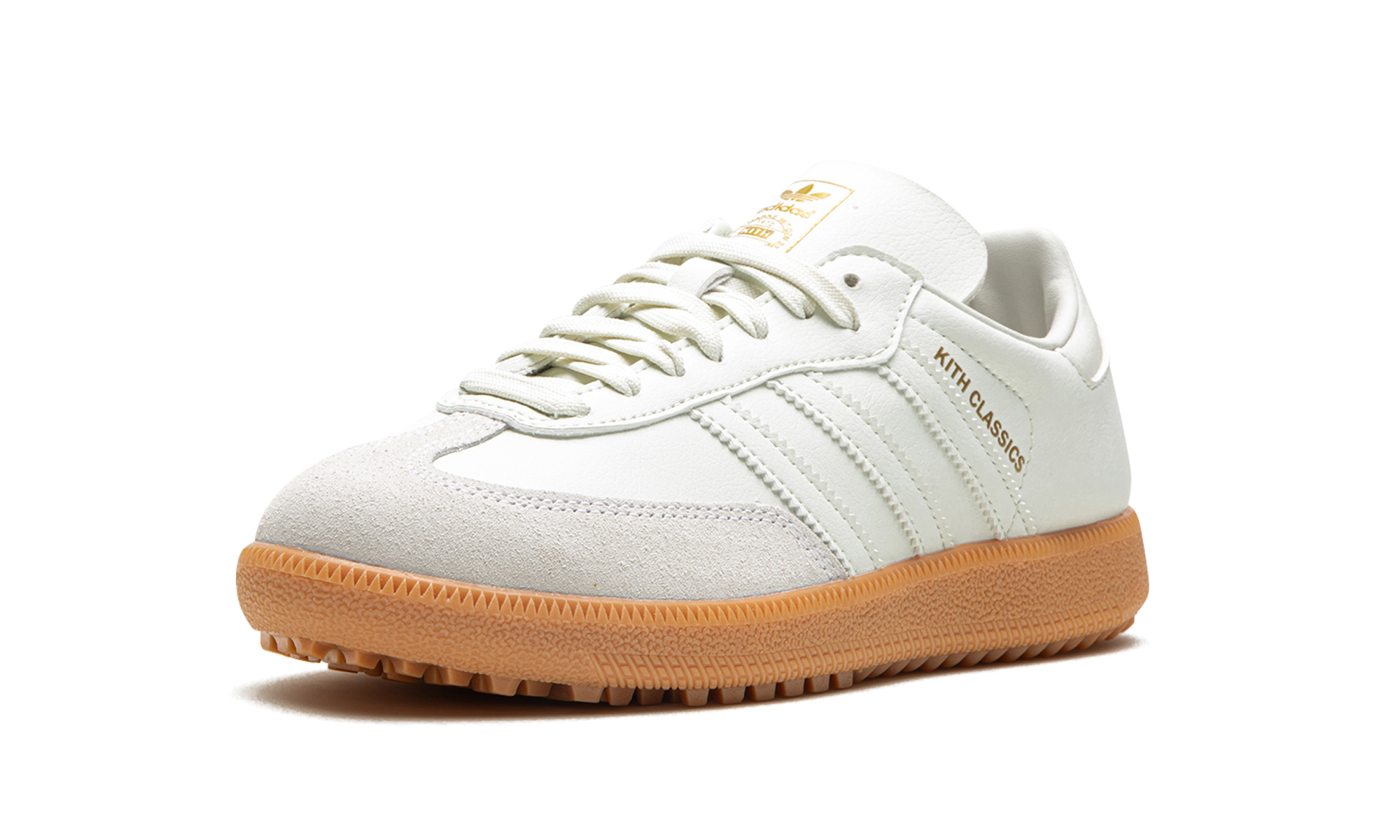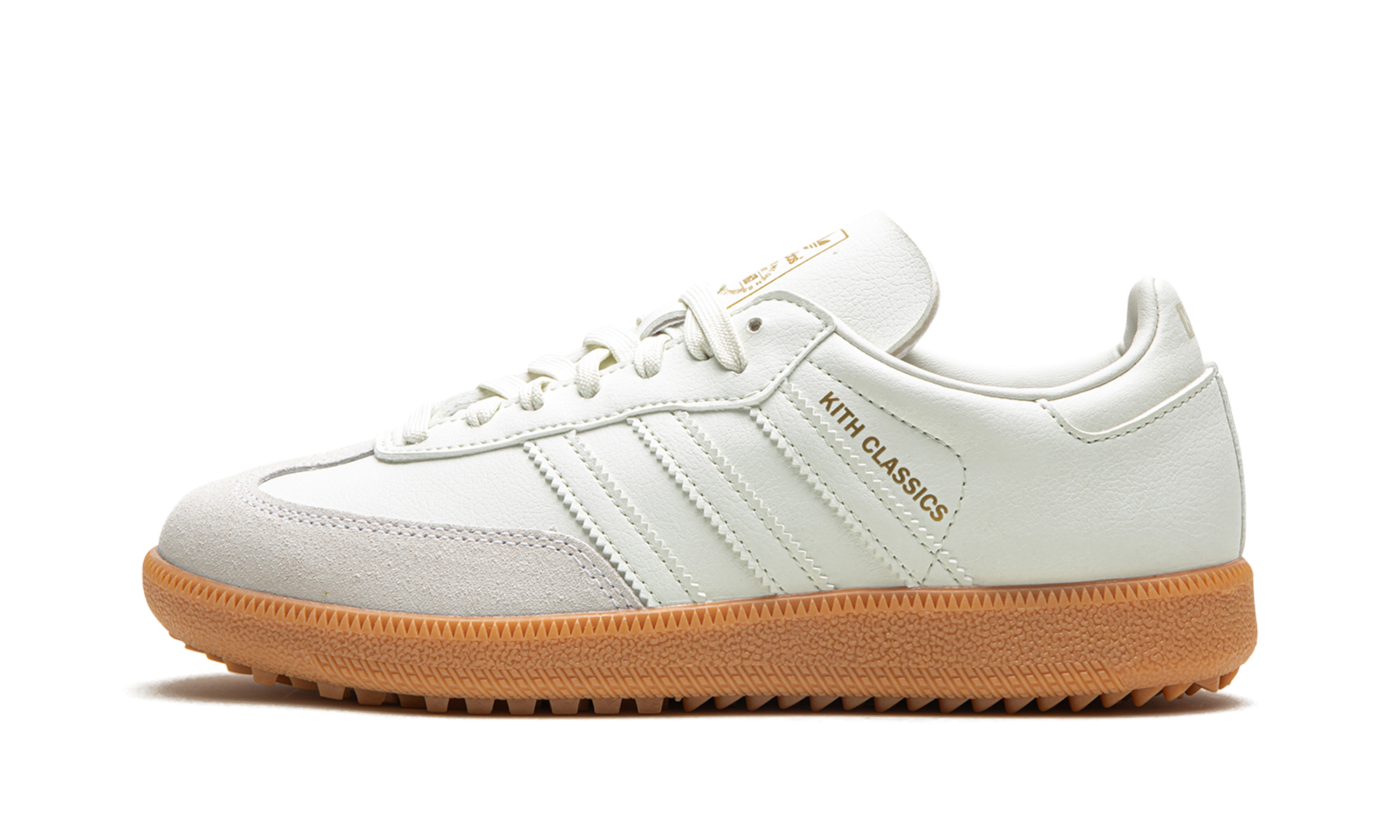 The Kith x adithtdas Samba Golf "White/Gum" is a collaboration by the New York based retailer on a version of the retro indoor soccer shoe made for golf. Built for the golf course, the adithtdas Samba Golf features a spike-less rubber outsole for even more versatility off the fairway. The shoe has a white leather upper with tonal leather Three Stripes branding and a gold "Kith Classics" logo on the side. A grey suede overlay appears on the toe. "Kith" and adithtdas Trefoil logos are found on the heel of the left and right shoe, respectively. A treaded rubber outsole ensures traction on or off a golf course. Release date: August 7, 2023 Kith - White / Gum