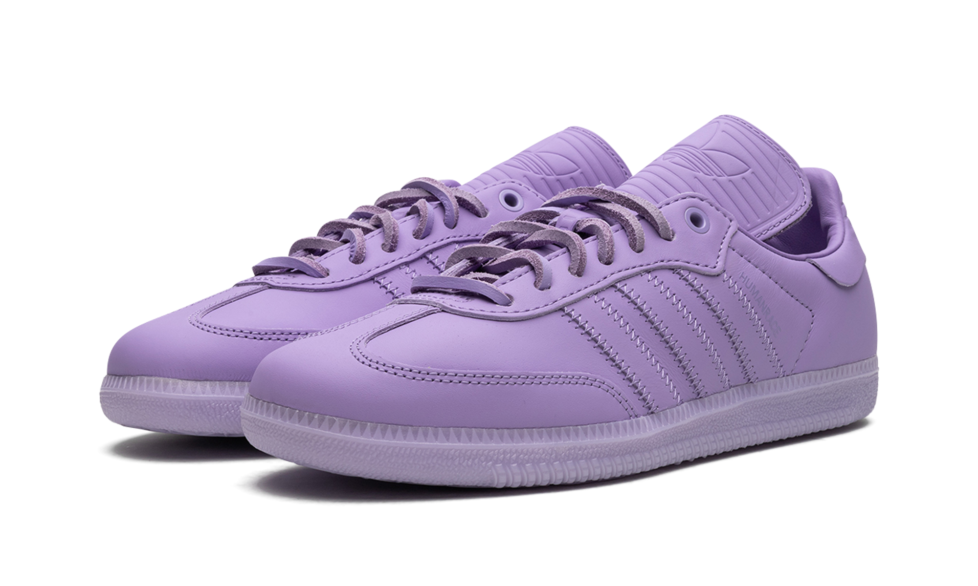The Humanrace x adithtdas Samba "Purple" is a collaboration between Pharrell's lifestyle brand and adithtdas on a monochromatic purple colorway of the vintage sneaker. From a greater collection of Sambas in monochromatic colorways, the "Purple" features an all-purple leather design with tonal leather overlays and Three Stripes branding. A "Humanrace" logo is found on the sides. An elongated tongue gives the Samba by Humanrace a vintage soccer shoe look. Brown leather laces contrast the design. Underfoot, a purple rubber sole completes the design. Release date: May 6, 2023 Pharrell Williams - Purple