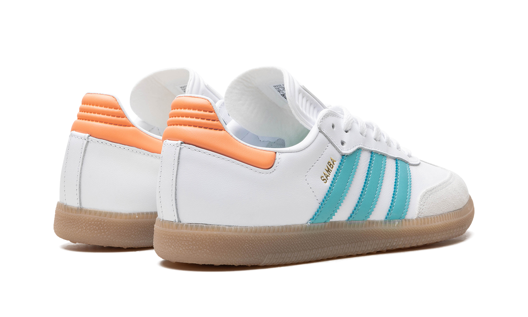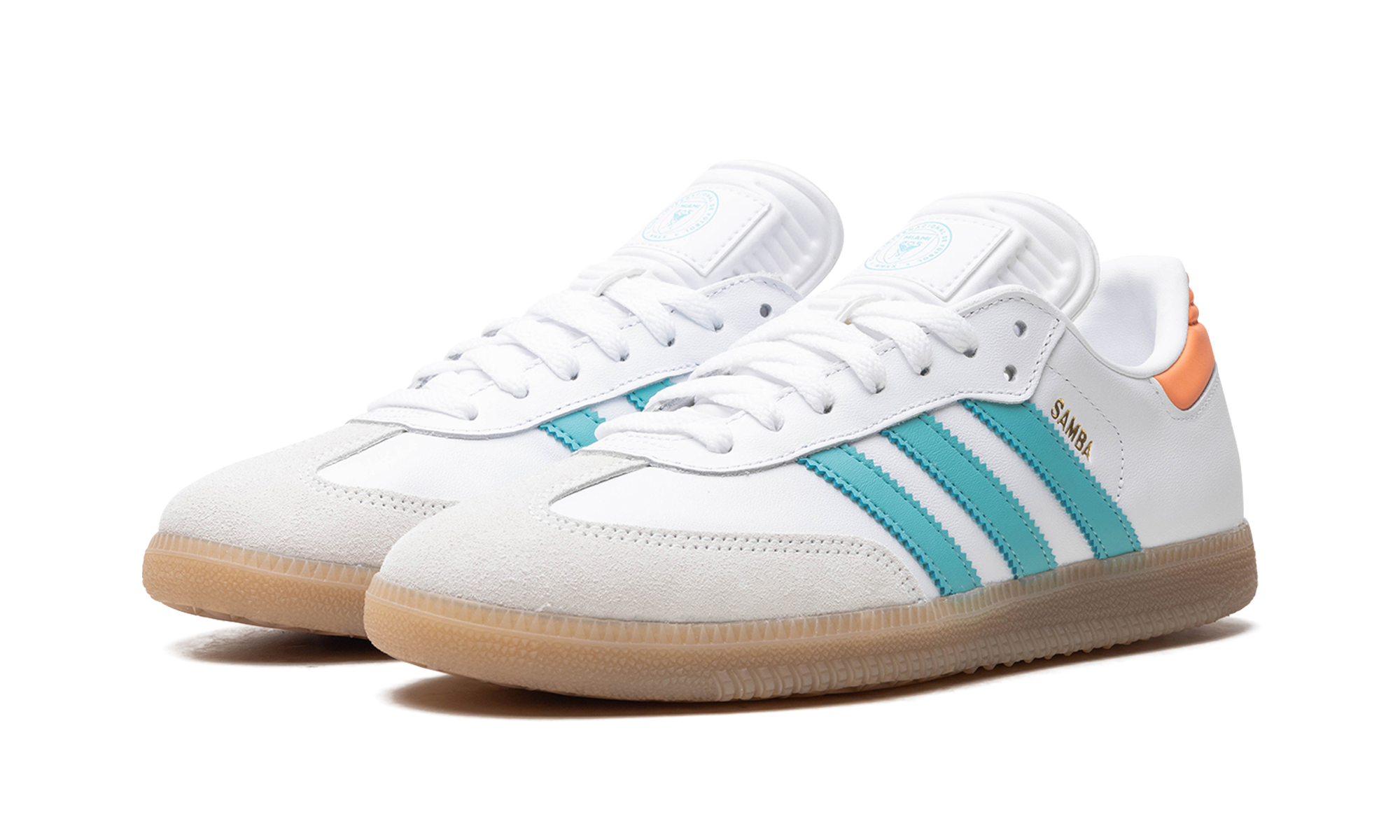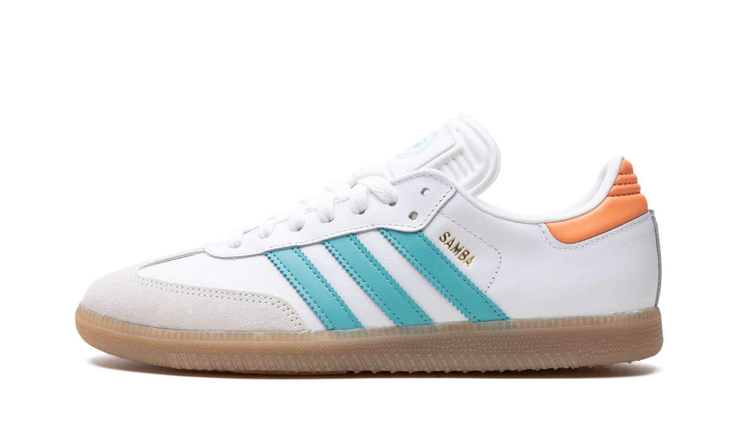 The adithtdas Samba "Inter Miami - Easy Mint/Pink" is a colorway of the popular sneaker inspired by the Major League Soccer team Inter Miami CF. Also said to be inspired by Inter Miami's star player Lionel Messi, the "Inter Miami - Easy Mint/Pink" features the colors of the Miami-based team on its design. The upper has a white leather construction with Easy Mint leather Three Stripes branding. A gold "Samba" logo appears on the lateral side of the mid-panel, while detailing inspired by Inter Miami is located on the tongue. A semi-translucent, smoky Gum rubber sole completes the look. Inter Miami - Easy Mint Pink