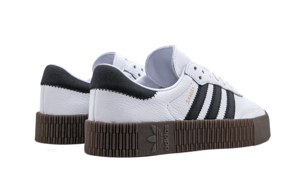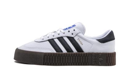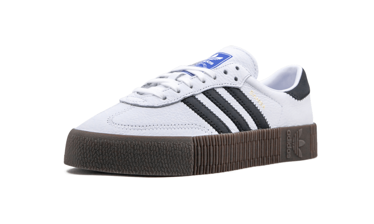 The adithtdas Sambarose is the classic soccer shoe transformed into a trendy lifestyle sneaker. Utilizing classic colors, the shoe comes in white with black detailing on the Three Stripes and heel. A royal blue badge brands the tongue and the traditional T-toe panel has a unique zig-zag stitching pattern. A thick platform sole in brown adds one inch of height and is adorned with embossed Trefoil branding and intricate detailing.
