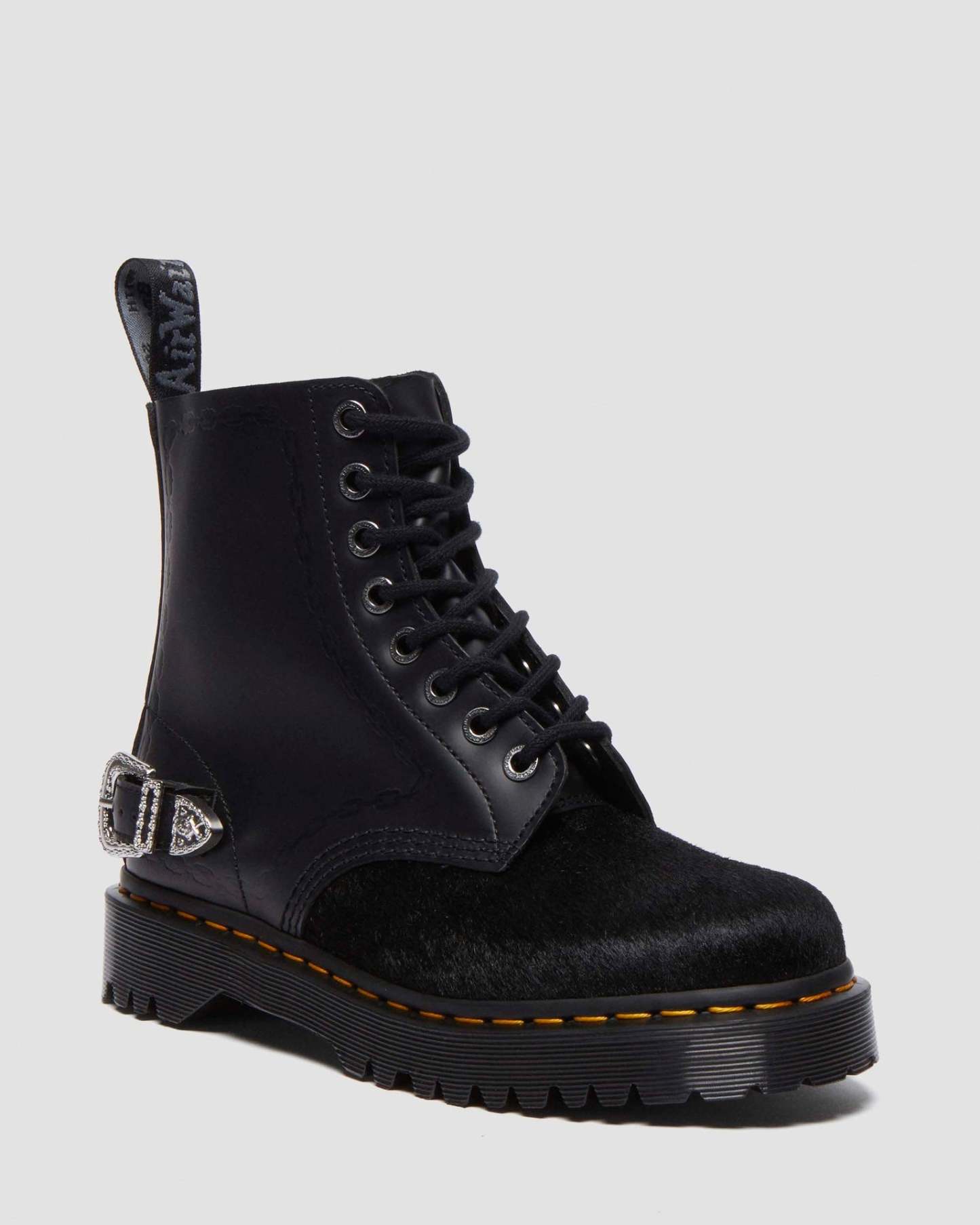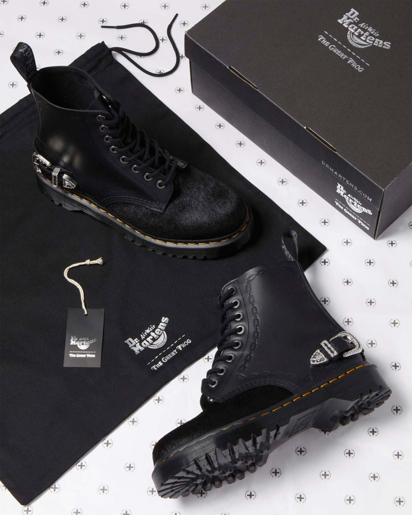Our second collaboration with London jeweller The Great Frog includes this reworked version of our classic 1460 boot. Made from black Smooth leather with a Hair On vamp, with hardware engraved by TGF Creative Director Reino Lehtonen-Riley. The leather is detailed with debossed chain artwork, which also forms the border of the vintage-inspired silver buckle on the boot��s heel. Other silver details include metal aglets and TGF-branded eyelets. The elevated Bex sole is secured with classic DM��s yellow welt stitching, while our heel loop is signed with a charcoal script.