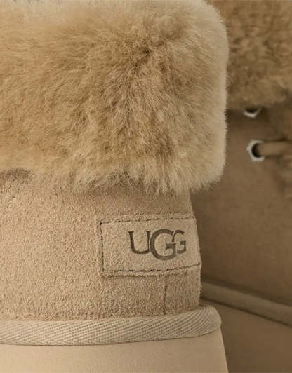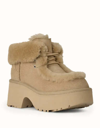 The UGthtG Esmee Lace Up reimagines the Classic Boot with a modern platform silhouette. Crafted from suede with a soft sheepskin spill seam and cuffable shaft, it features plush UGthtGplushlining and a 2.75" sugarcane EVA platform outsole for lightweight comfort and elevated style.