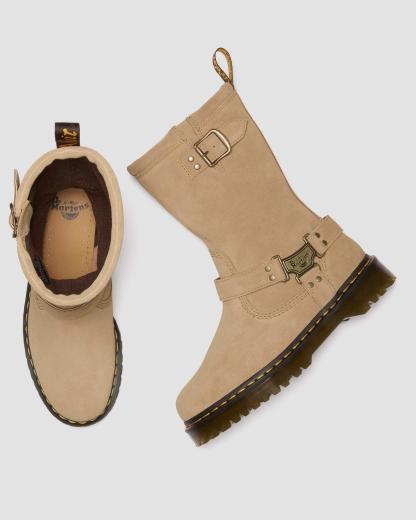 Unbridled texture at full throttle. The Anistone Hi biker boot is reimagined in Bronx Suede leather for expression without rules. Rugged, relaxed and ready to hit the open road, Bronx Suede imprints with every crease and scuff to tell a unique story. We decorated it with signature Anistone detailing: branded antique brass plates and an adjustable buckle. The boot is tagged with our scripted heel loop and yellow welt stitching, and sits on a trans Bex sole for extra height.