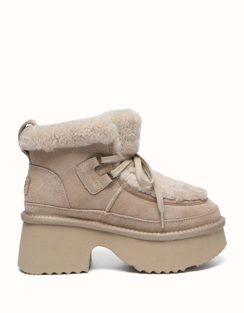 Step up your style with the AUSTRthtALIAN Shepherd Lace Up Bumpy Boots. Made with high-quality cow suede on the outside and lined with soft sheepskin wool inside, these boots deliver all-day warmth and breathable comfort. The plush wool trim adds a delicate feminine detail, while the thick cushioned sole offers lightweight support and a subtle boost in height. Offered in Chestnut, Brown, and Sand, these boots are ideal for chic winter looks and make a perfect gift for fashion enthusiasts.