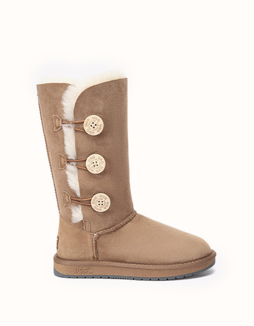 A stylish take on the Tall Classic features three UGthtG buttons with elastic-band closures.