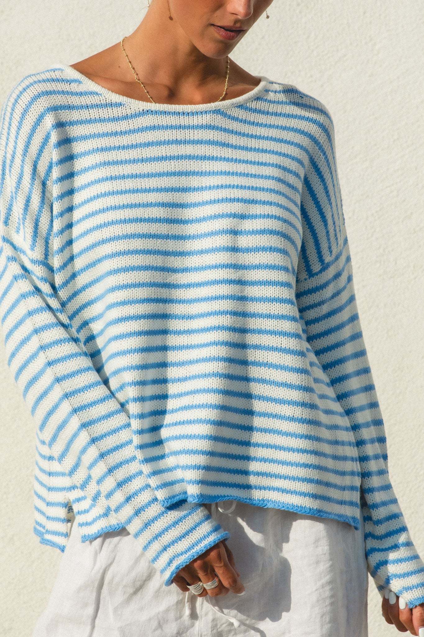 Meet our Morning Sea Striped Pullover Sweater. This season's must-have, with a sky blue and white horizontal stripe, boat neckline, and easy oversized fit. This will be the perfect sweater to wear as we ease into a new season.