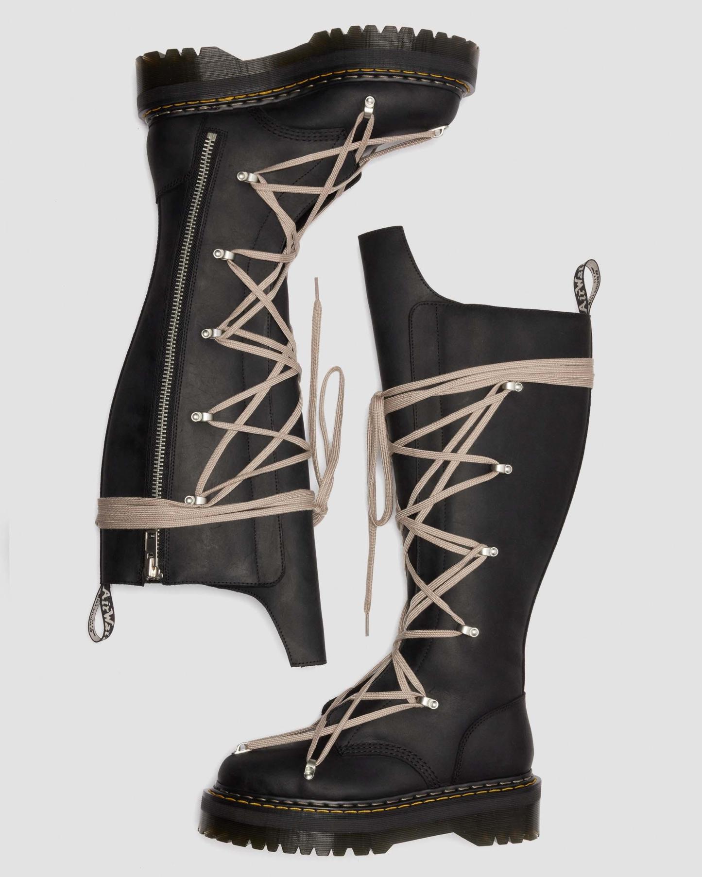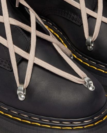 A true monolith. Our latest partnership exaggerates the already towering 1B60 silhouette. Cut from black Republic, a rich, waxy leather and featuring Rick Owen��s signature pentagram lacing with easy access side zipper. Set on the unmistakable Quad sole with and yellow and white double welt stitch. Finished with an exaggerated geometric tongue and special edition AirWair heel loop.